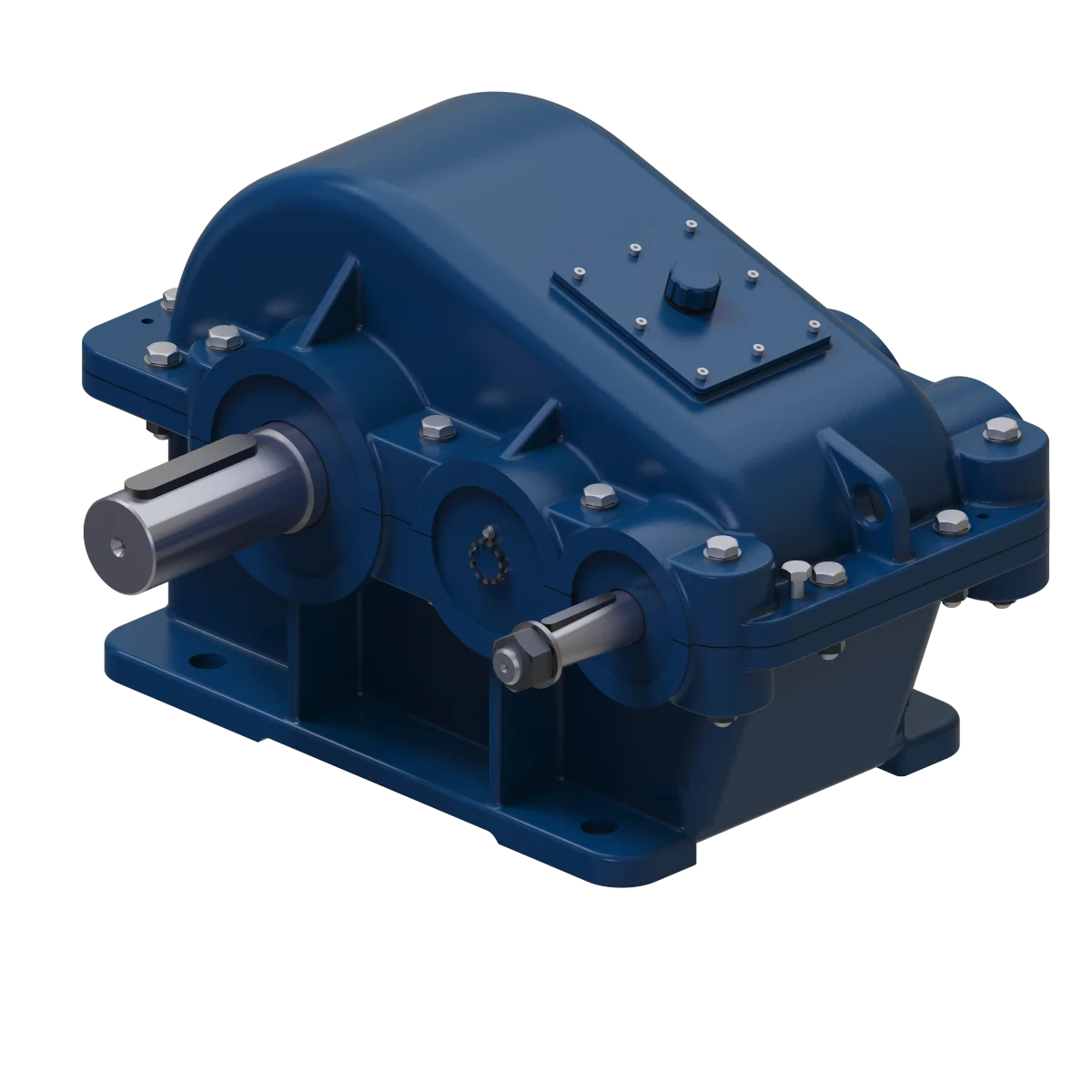 Конструкция редуктора включает две ступени зубчатых передач с шевронным зацеплением на быстроходной ступени. Это улучшает динамику работы, снижает уровень шума и способствует плавной передаче мощности, что критически важно для достижения высокой надежности и долговечности в эксплуатации.